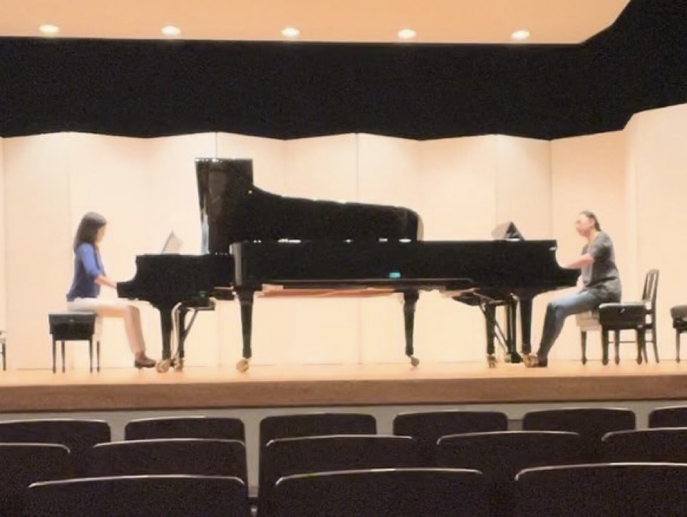 会場のホールで、ピアノや椅子の位置、出入り動線の確認などをしながら、