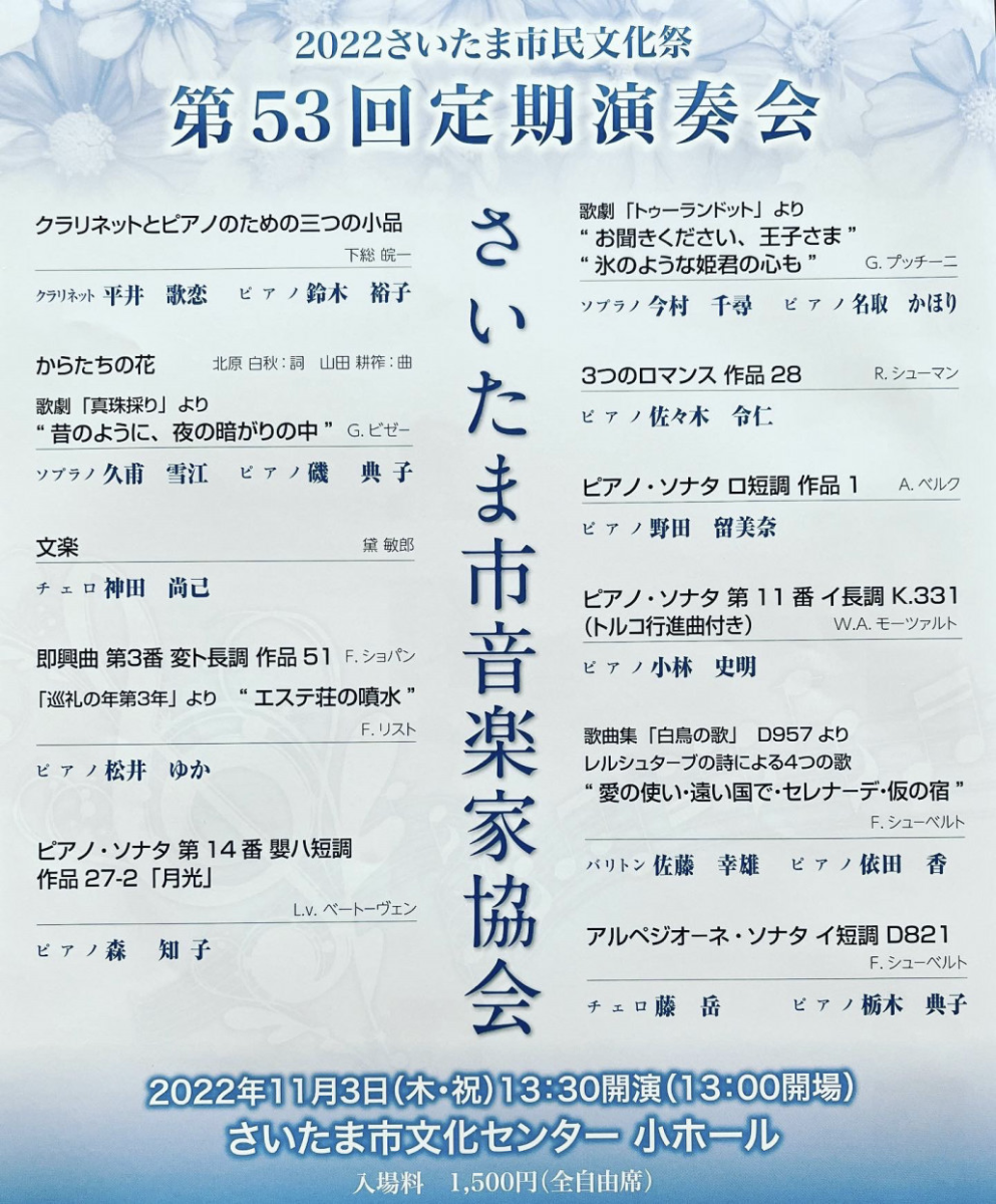 11月3日(木・祝)13:30開演の、「さいたま市音楽家協会 第53回定期演奏会」にて、