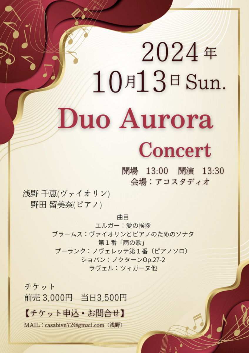 さて、この度ヴァイオリニストの浅野千恵さんと「Duo Aurora(デュオ・アウローラ)」を結成し、